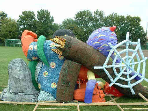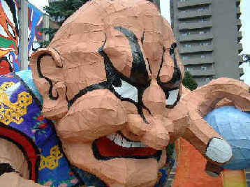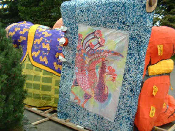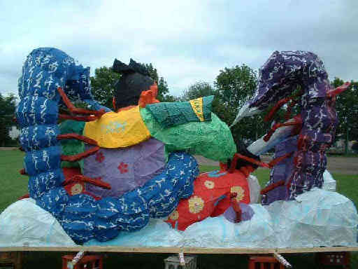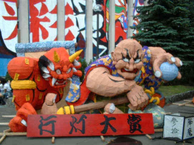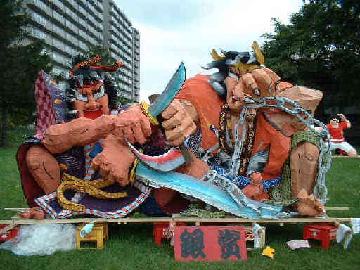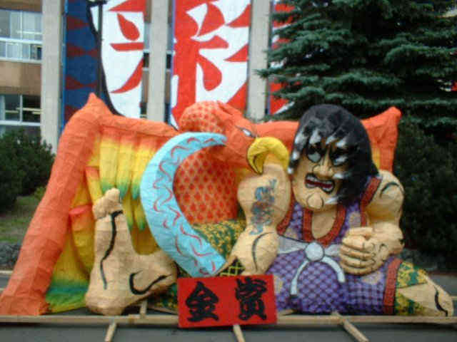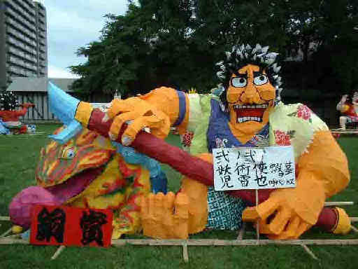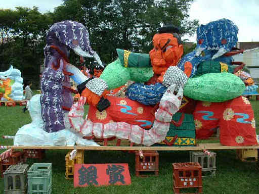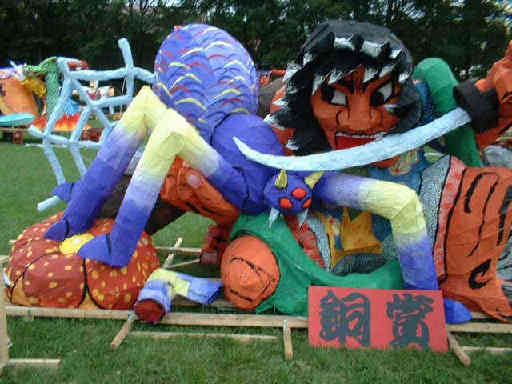 ![]() | 54th三年銀賞 | 大百足退治 | 裏 夜 | 仕:まずはなんといっても題材の妙と、百足に書かれた文字でしょう。奇抜とも取れる題材、アイデアをうまくまとめたと思います。目をセロファンで貼り、その中の電球を意図的に(と解釈しましたが)揺らしたのも賛否はともかく面白かったです。動的な百足に対し、いくらか人間の構図がおとなしすぎたのではという印象を受けました。 ナ:ムカデを3体も作り上手く空間を埋めている。 芋:なかなか斬新な題材です。電飾も見事でした。 め:百足と人の絡みがおもしろいです。百足の柄に困ったと思いますがよく工夫されています 遊:百足の行灯初めて見ました。針金もしっかりしてましたし。 |