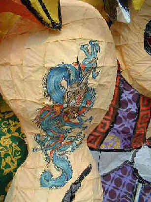 ![]() | 54th三年金賞 | 華炎 | 龍 夜 | 仕:きれいに仕上げられた鳥の羽と大胆に入れられた墨入れなど、美しさという行灯の方向性をはっきりと見せてくれたと思います。構図的な問題なのでしょうが、後ろが平面的になってしまったのが惜しいところでした。定められた時間の中では難しいでしょうが、出来ればもう一工夫見せてもらいたかったです。 ナ:鳥の羽の奇麗なグラデーションがとても良い。 芋:鳳凰のグラデーションは、夜とてもきれいでした。 め:色塗りがとても丁寧でした。グラデーションもよくできています。 遊:中央の龍の絵と、墨入れの力強さが印象的。 |